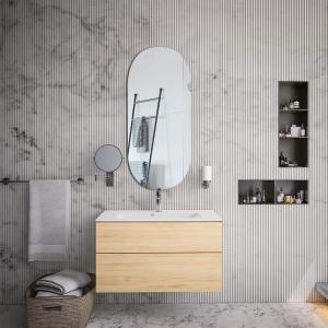 - The pre-assembled bathroom vanity unit is available in white, oak structure or grey with a soft matt finish
